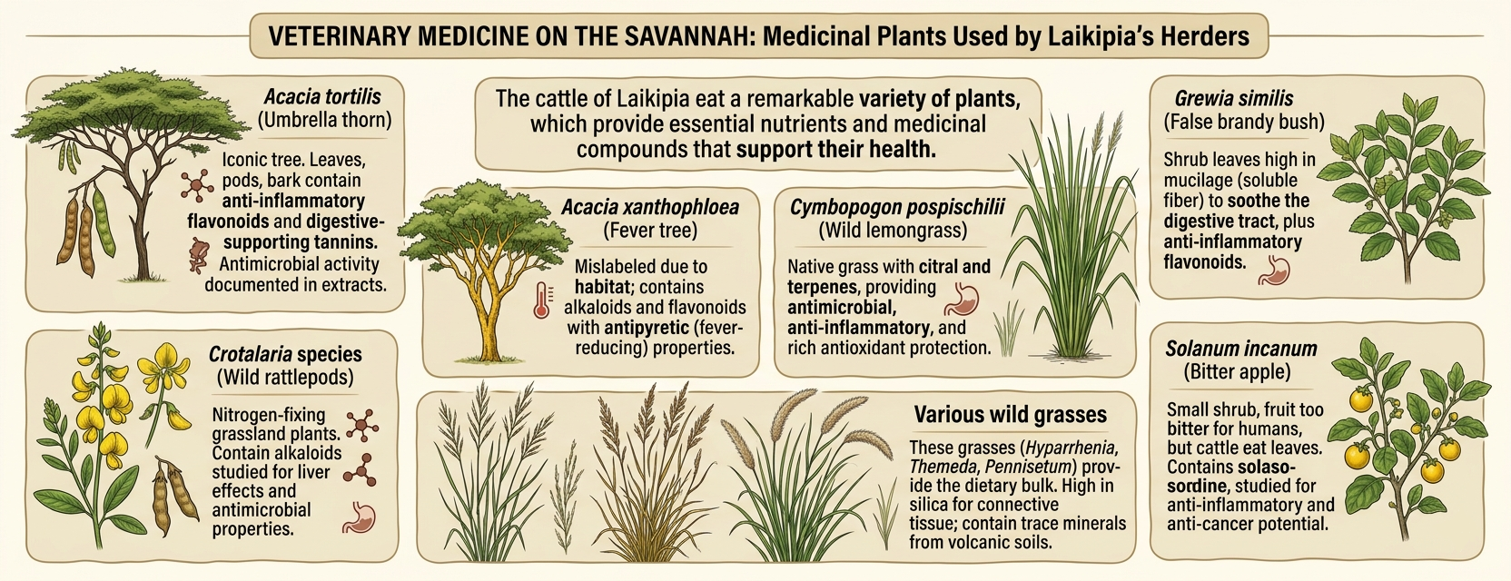 Several Commiphora species grow in Turkana, producing resin-rich leaves that cattle browse. These contain compounds with documented antimicrobial, anti-inflammatory, and wound-healing properties. Myrrh has been used in traditional medicine for thousands of years, and here it enters the cattle's diet directly.