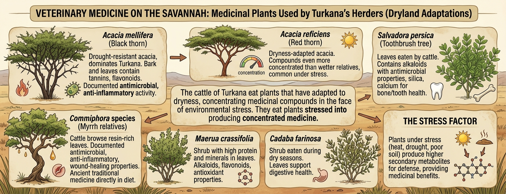 The stress factor: Plants growing under stress, heat, drought, poor soil, often produce higher amounts of secondary metabolites, including the compounds that serve as plant defense and that provide medicinal benefits. The cattle of Turkana are not just eating plants. They are eating plants that have been stressed into producing concentrated medicine.