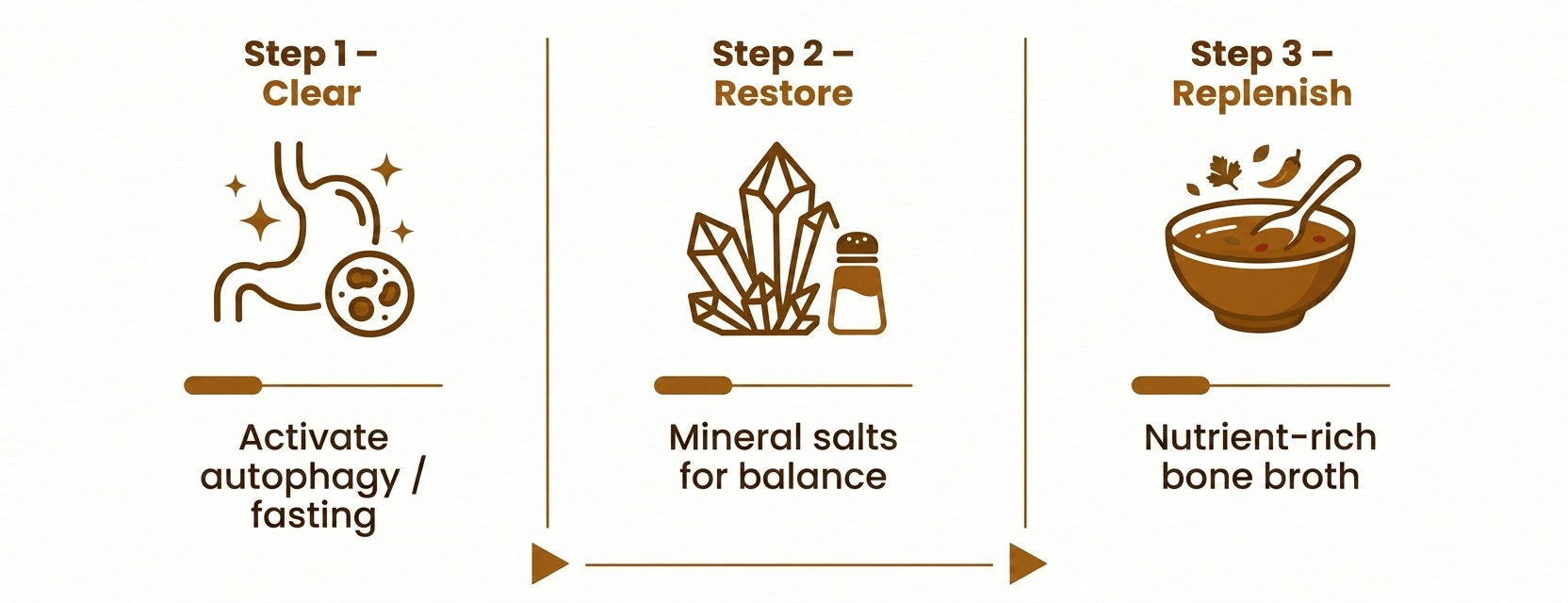 Repetition: Repeat this three-step cycle as many times as you can. Each cycle creates another wave of autophagic flux, another round of mineral restoration, another dose of gut-healing nutrition. The cumulative effect is profound. Your health will improve tremendously.